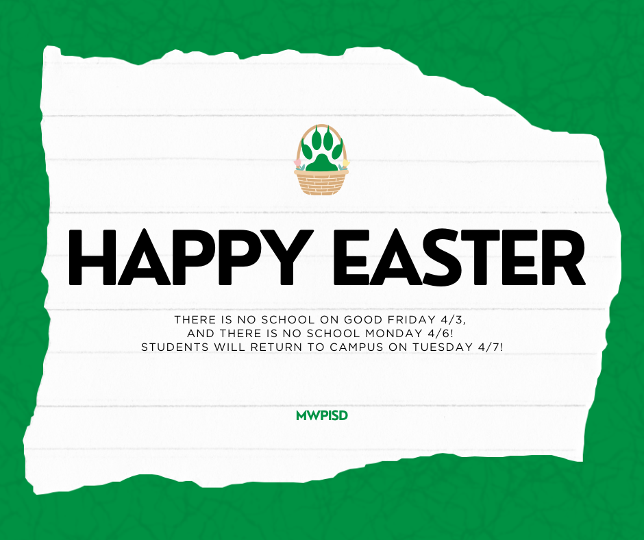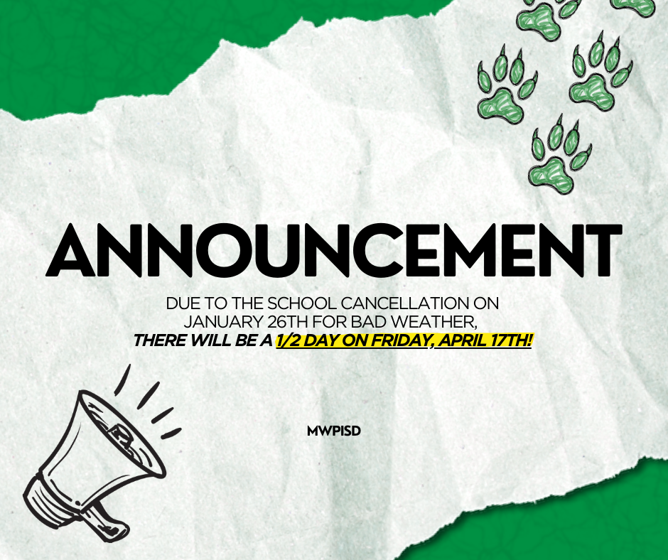 Attention MWPISD Families! Due to school being cancelled on January 26th for bad weather, there will be a 1/2 day of school on Friday, April 17th!According to the TEA instructional minutes requirem...
