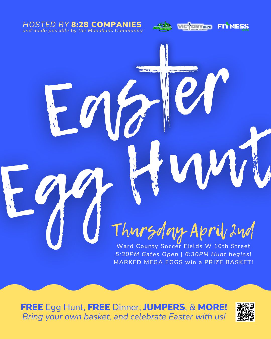 The 8:28 Companies are hosting a free community wide Easter Egg Hunt for families in Monahans, and beyond! All of our students, and their families, are invited to enjoy a free meal, hunt over 35,00...